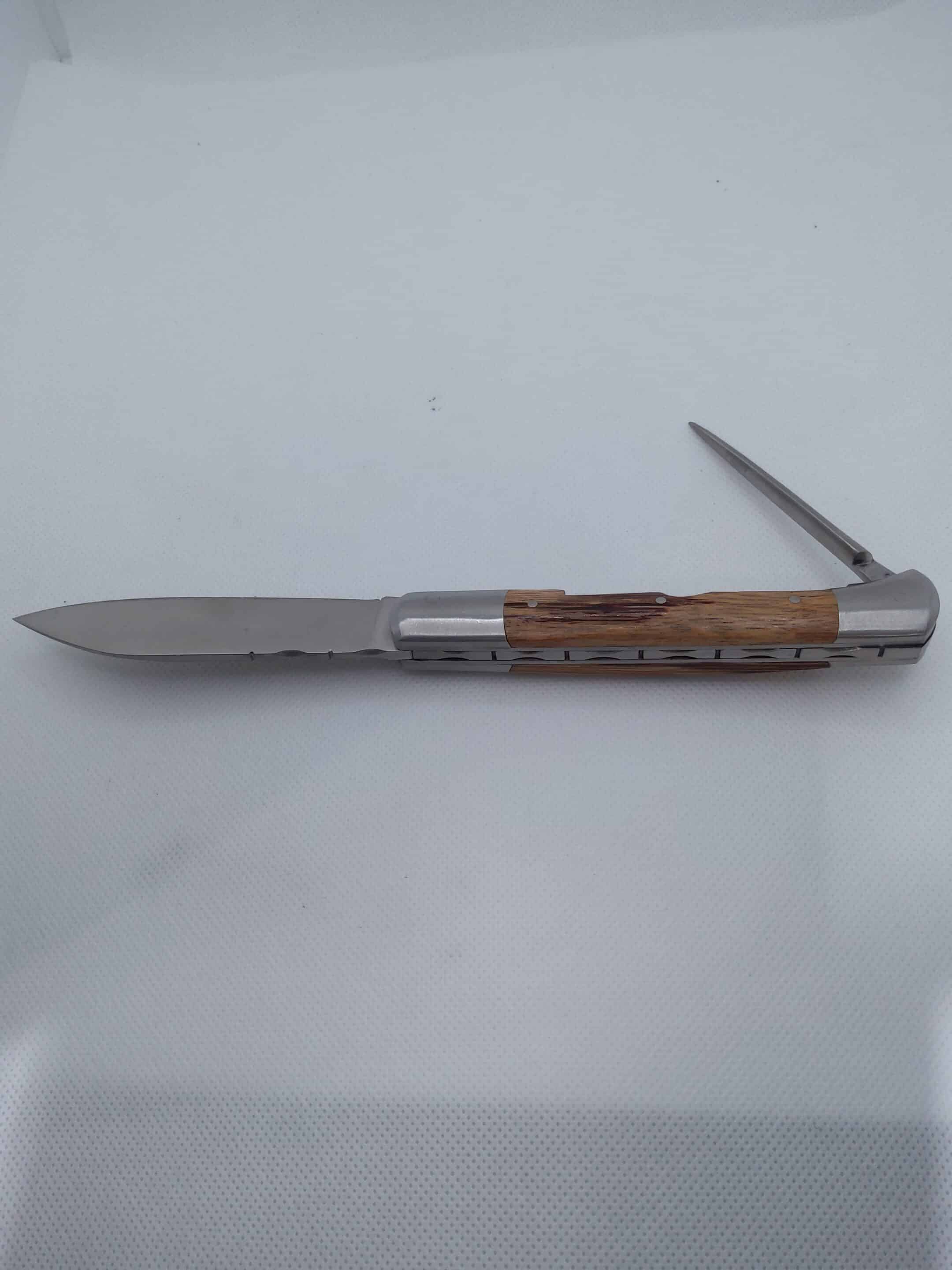 Le manche associe la robustesse de l’acier à la chaleur naturelle du bois, dont les nuances profondes et les veines marquées rendent chaque pièce unique. Les finitions soignées et les rivets apparents soulignent un travail artisanal exigeant.