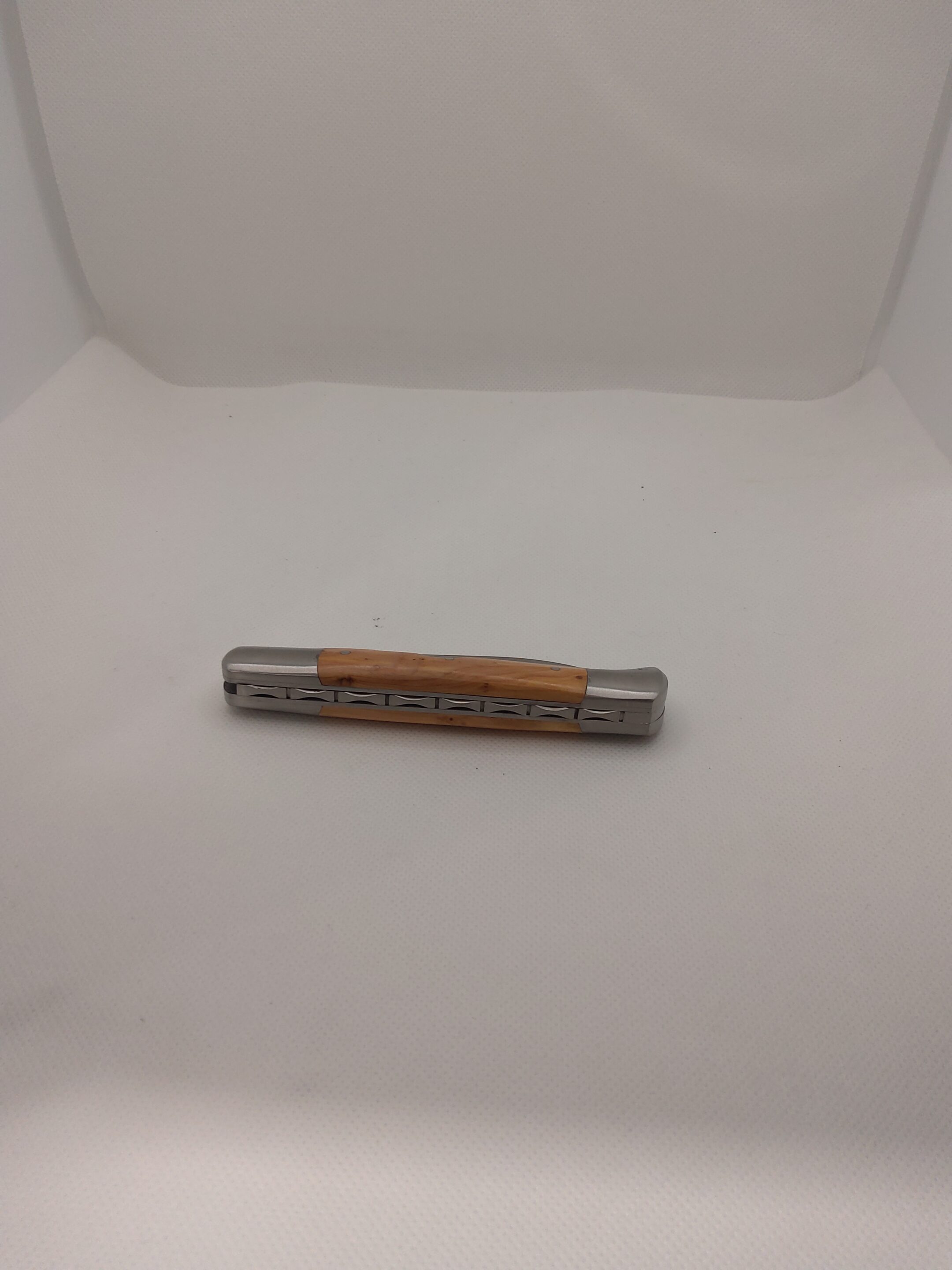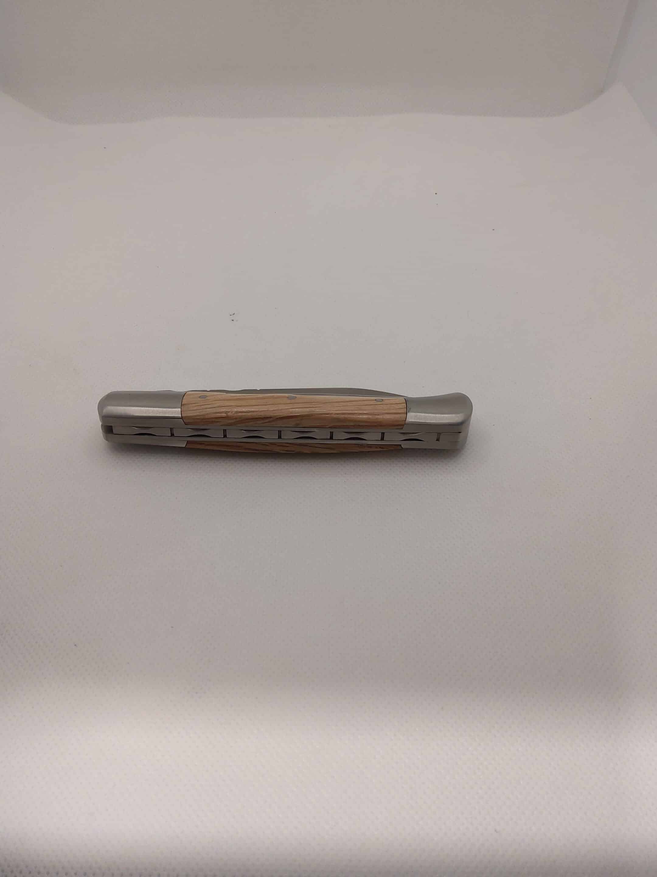 Le manche associe la robustesse de l’acier à la chaleur naturelle du bois, dont les nuances profondes et les veines marquées rendent chaque pièce unique. Les finitions soignées et les rivets apparents soulignent un travail artisanal exigeant.