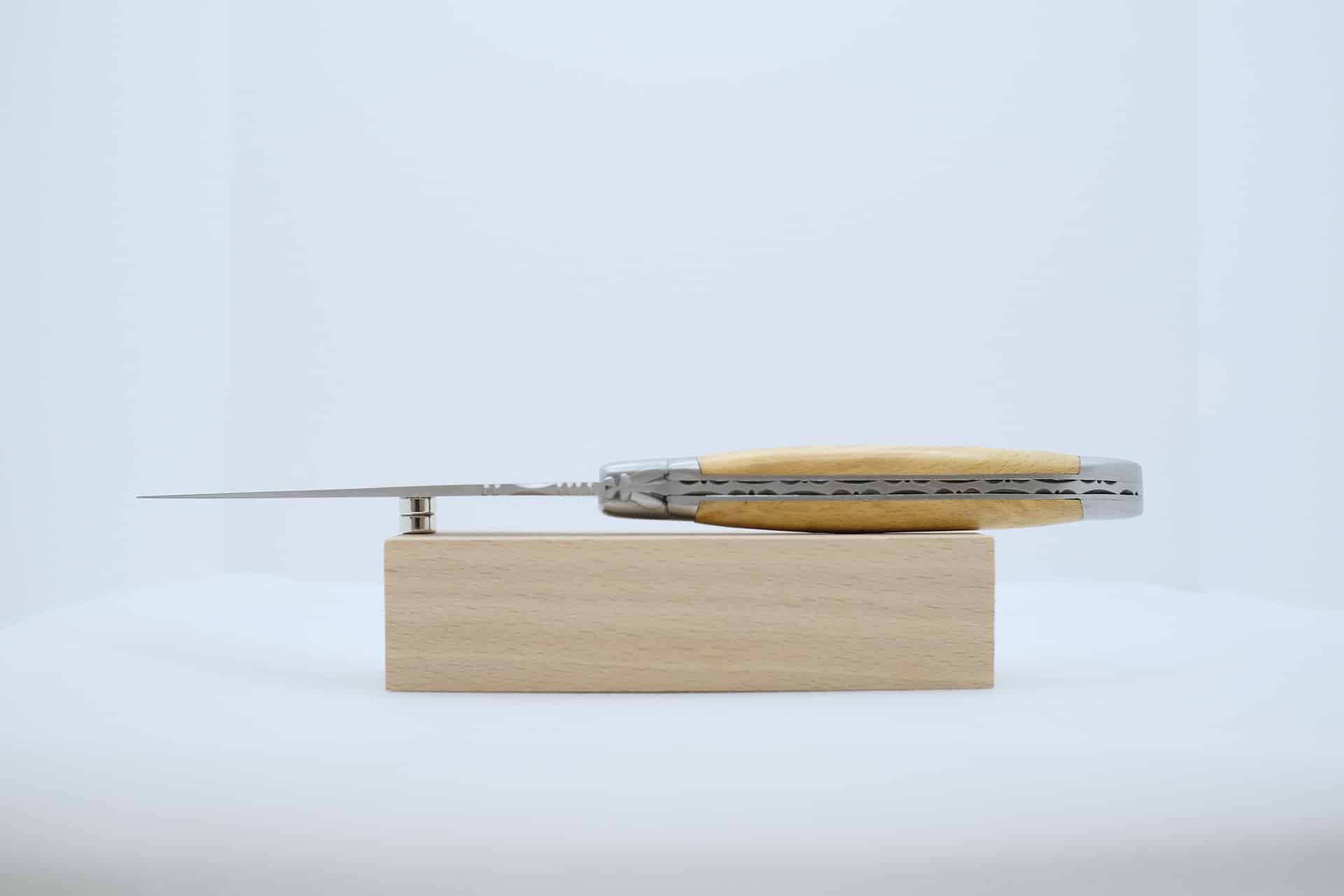 Couteau Laguiole de 12cm, manche en Buis. Mouche forgé, ressort guilloché. Lame, ressort, platines et deux mitres en inox brossé. Lame en acier 12 C 27.