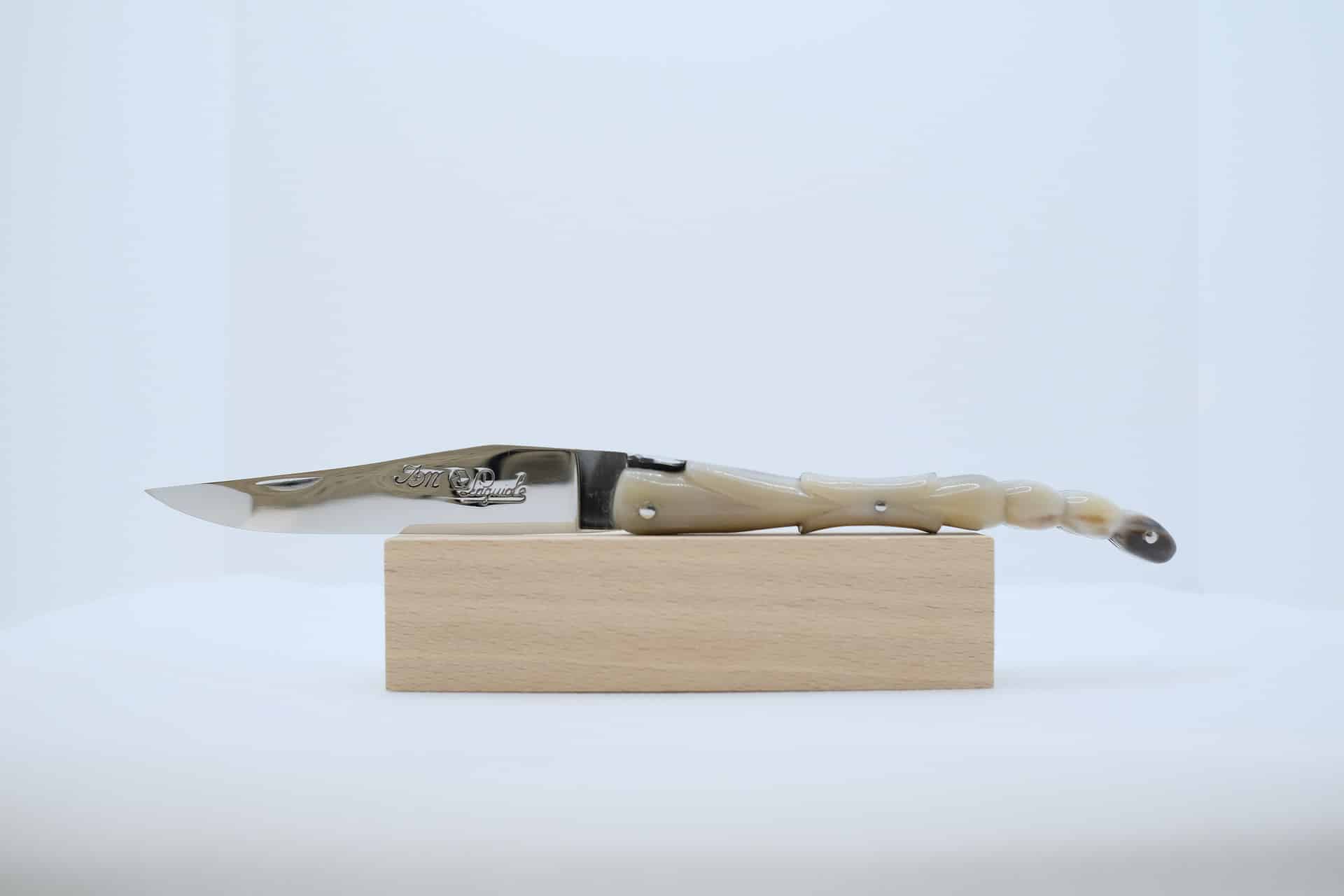 Couteau Laguiole Aile de Pigeon de 12cm, plein manche en pointe de corne. Ressort forgé. Lame, ressort et platines polis miroir. Lame en acier 12 C 27.