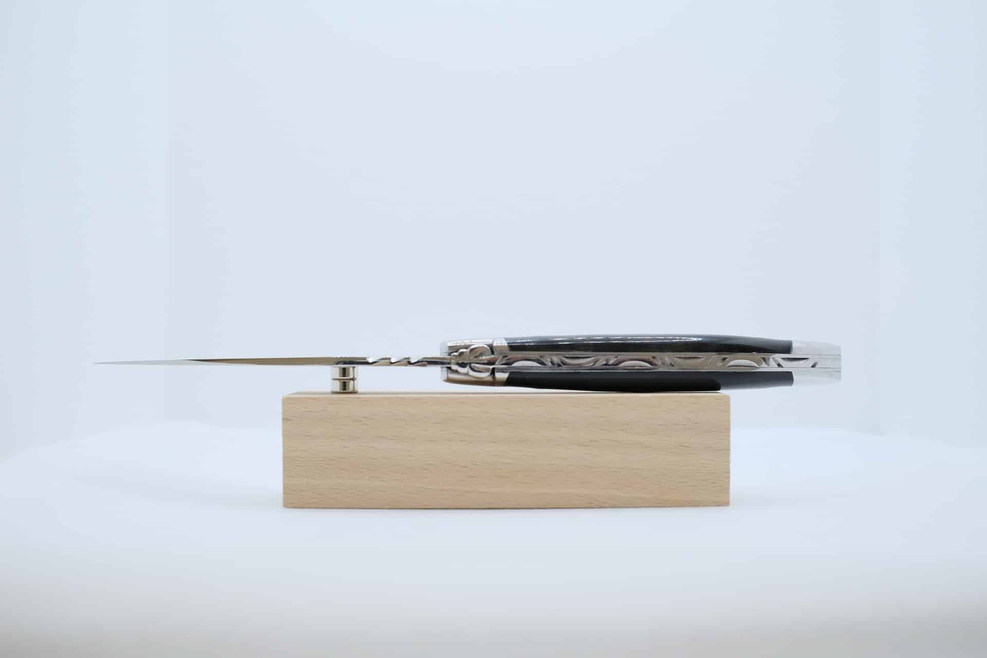 Couteau Laguiole de 12cm. Manche en Corne de Buffle Noir, mouche forgé, ressort guillochée. Lame, ressort, platines et deux mitres inox poli miroir.