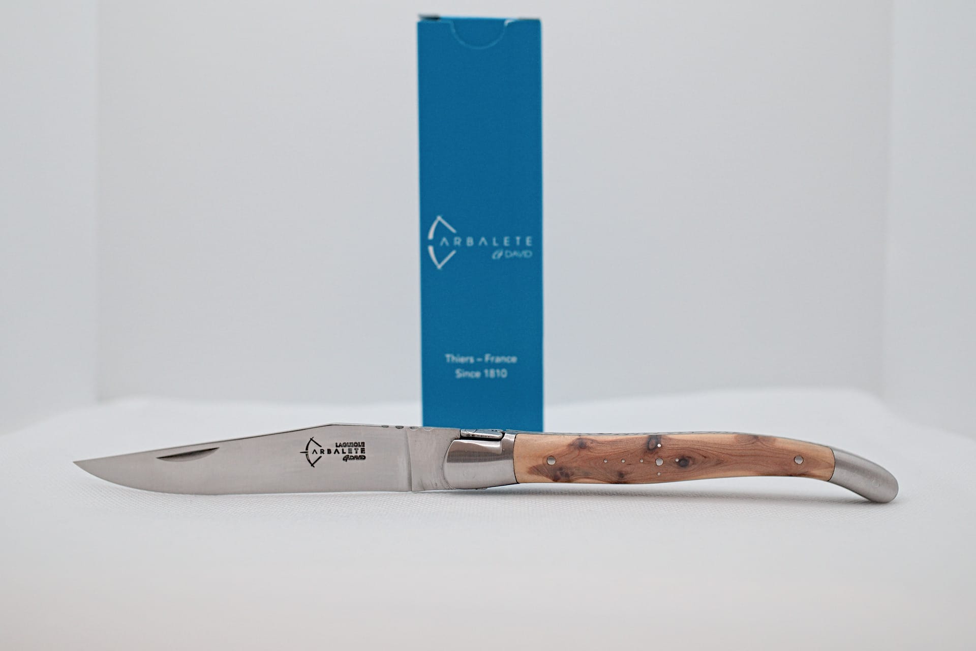 Ce Laguiole Arbalète David de 12cm est monté avec un manche en genévrier et deux mitres inox.