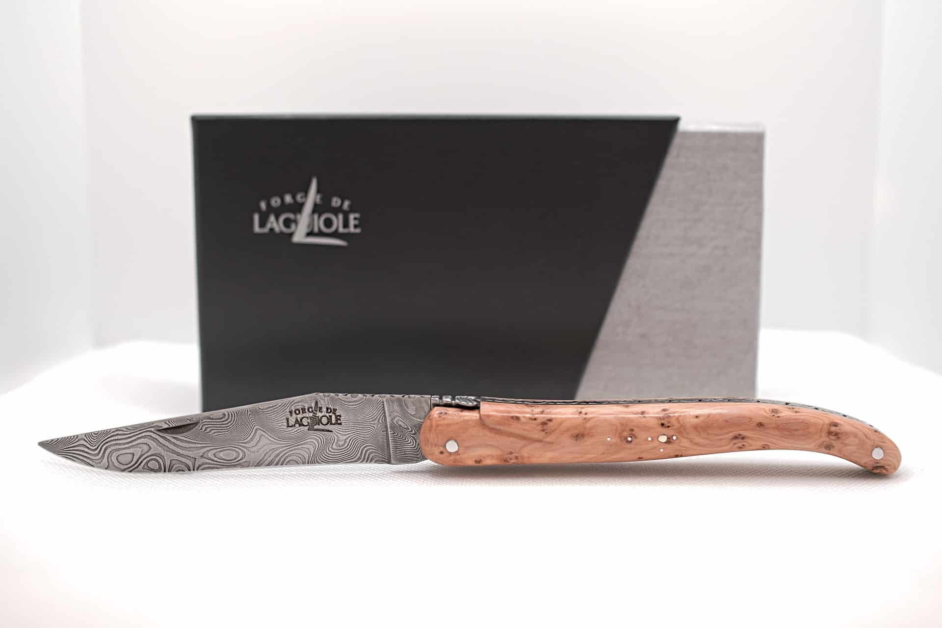 Ce Laguiole de 12cm a été fabriqué par la Forge de Laguiole dans l’Aveyron. Il est monté avec un plein manche en Genévrier et une lame en Damas Carbone. Le ressort et l’abeille sont ciselés main.