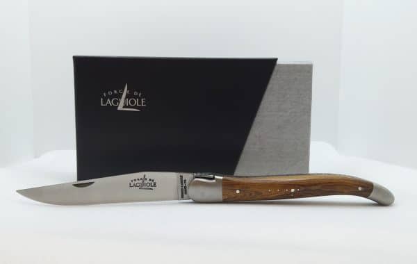 Ce Laguiole de 12cm a été fabriqué par la Forge de Laguiole dans l’Aveyron. Il est monté avec un manche en Pistachier et les mitres inox ainsi que la lame en T12 sont satinés.